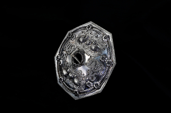 Das lange Kleid besteht aus drei unterschiedlichen Stoffarten, ist maschinengenäht und vollständig mit Taft gefüttert. Rückenteil sowie der Rockbereich des Vorderteils sind aus einem schweren, schwarzen Stoff gearbeitet. Der obere Vorderteilbereich sowie die Manschetten der langen Ärmel bestehen aus einem schwarz-goldenen Dekorstoff mit horizontalen Streifen aus Kreis- und Blütenmotiven. Die Ärmel selbst sind aus leicht transparentem, feinem schwarzen Plissee gefertigt; die Manschetten schließen mit drei Knöpfen. Das Rückenteil ist in der hinteren Mitte durchgeschnitten und verfügt dort über einen eingenähten Reißverschluss; Taillen- und Schulterabnäher formen den Sitz. Das vordere Oberteil ist spitz zulaufend gestaltet, und der anschließende Rock weist in der vorderen Mitte eine tiefe Kellerfalte auf. Auch hier sorgen Taillenabnäher für eine körpernahe Formgebung.