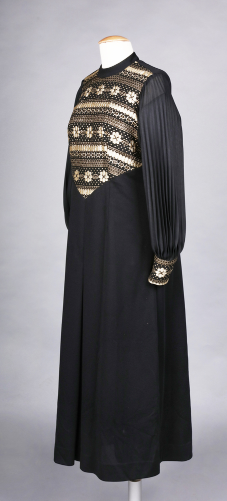 Im späten 20. Jahrhundert wurden Materialkontraste, ornamentale Einsätze und schlichte Grundformen in der Mode häufig kombiniert. Die Verbindung von Plisseeärmeln, metallisch wirkenden Goldmustern und einer klaren, langen Silhouette des Kleids verweisen auf festliche oder halbformelle Trageanlässe.