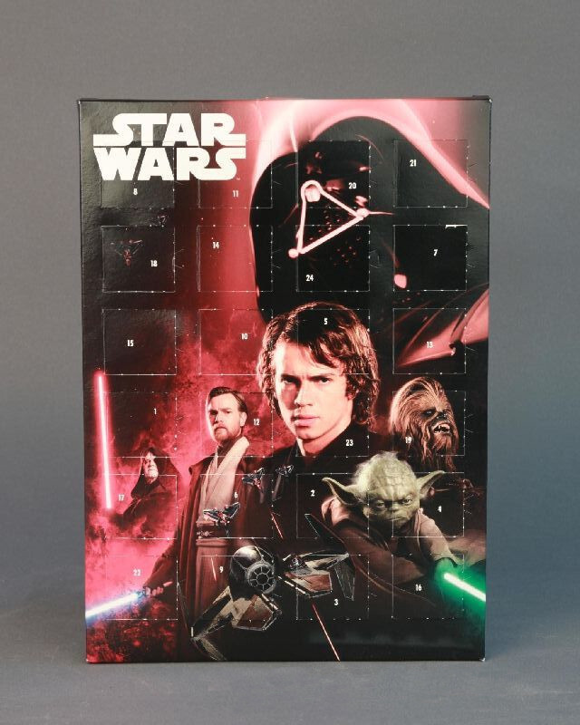 Schokoladen-Adventskalender mit 24 aufklappbaren Türchen in Star Wars-Optik. Das Hauptmotiv bilden Figuren aus dem Film "Star Wars: Episode III". Im Vordergrund sind die Film-Charaktere Anakin Skywalker, Obi-Wan Kenobi, Yoda, Chewbacca und der Antagonist des Filmes, der Imperator, abgebildet. Den rot gehaltenen Hintergrund füllt eine große Darstellung von Darth Vader.