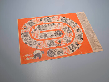 Spielplan aus Karton zum Ausklappen mit aufgedruckter Anleitung auf der Rückseite. Beiliegend zwei Würfel.