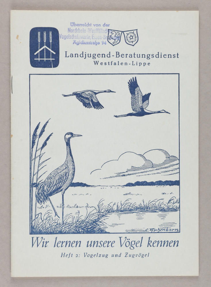 Broschüre des Landjugend-Beratungsdienstes Westfalen-Lippe. Das Cover prägt eine große Illustration von Carl Aschenborn. Zu sehen sind drei große Zugvögel (vermutlich Graureiher) auf einer weitläufigen Wiese an einem Gewässer. Der Titel der Broschüre befindet sich unterhalb der Illustration in leicht kursiver Schrift: "Wir lernen unsere Vögel kennen. Heft 2: Vogelzug und Zugvögel". Die geheftete Broschüre umfasst 24 Seiten im schwarz-weiß Druck.