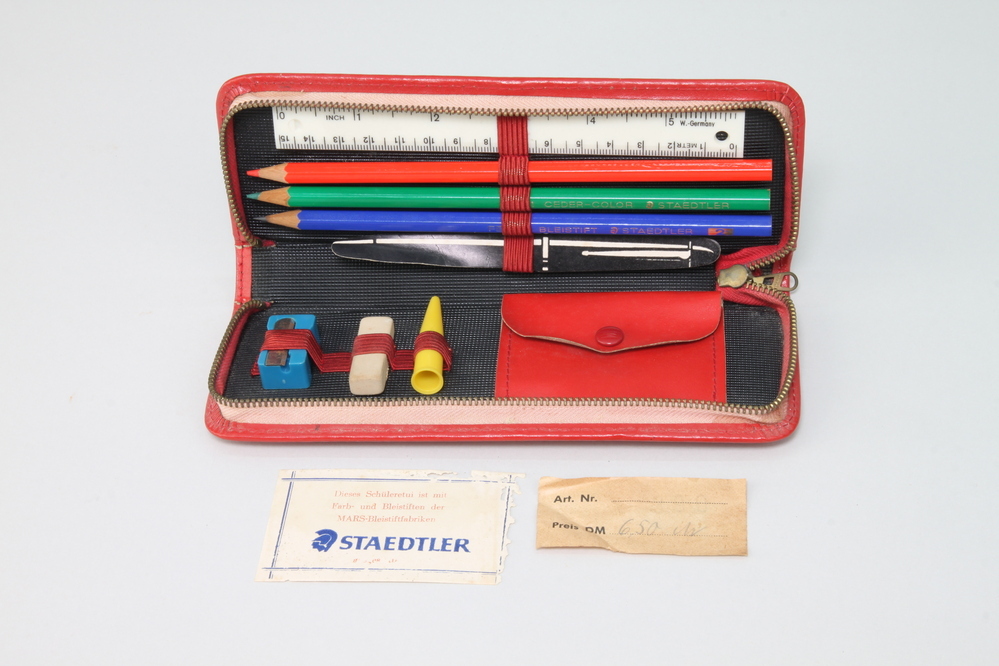 Rotes Schüleretui, oder Federmappe, mit umlaufendem Reißverschluss. Darin eingenäht ist ein kleiner Geldbeutel und zwei rote Gummibänder. Vom Gummiband gehalten werden 1 blauer Anspitzer, 1 weißes Radiergummi, 1 gelbe Stiftverlängerung aus Kunststoff, 1 weißes Lineal, 1 Bleistift (Härte 2), und 2 Buntstifte (rot und grün). An der Stelle des Füllfederhalters befindet sich ein Pappfüllfederhalter. Auf einem beiliegenden Artikelzettel ist vermerkt: "Art. Nr. 390, Preis DM 6,50" und auf einem Herstellerzettel: "Dieses Schüleretui ist mit Farb- und Bleistiften der MARS-Bleistiftfabriken STAEDTLER ausgestattet".