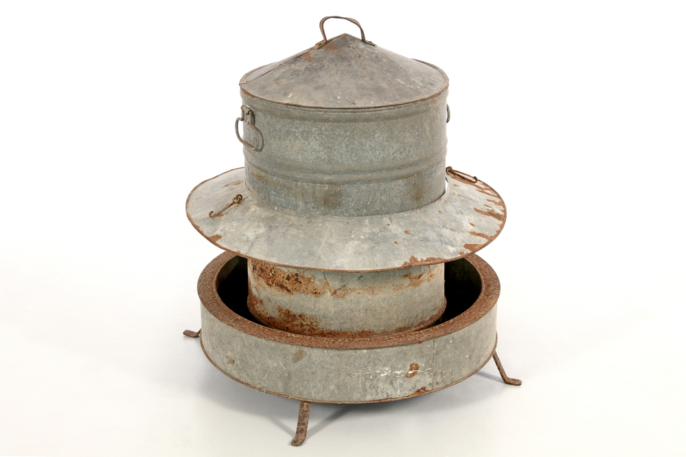 Geflügelfutterautomat zur Fütterung von Hühnern, Enten oder Gänsen. Das aus verzinktem Stahlblech gefertigte Gerät besteht aus einem tonnenförmigen Behälter mit zwei Haltegriffen, der in eine runde Fußschale eingesetzt ist. Durch eine kleine Wölbung in der Schale rutscht das im Behälter gelagerte Futter automatisch nach, sobald die Tiere daraus fressen. Ein umlaufender Blechring schützt das Futter vor Regenwasser und hält es trocken.