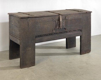 Bank mit Rückenlehne und einer Armlehne. Eine Armlehne fehlt, diese wurde wahrscheinlich absichtlich gekürzt. Es befinden sich rötliche und weiße Farbspuren auf dem Gestell. In der Rückenlehne befinden sich sechs geschweifte Sprossen.