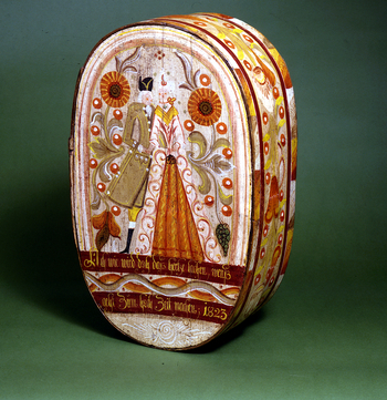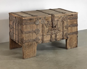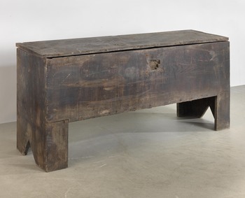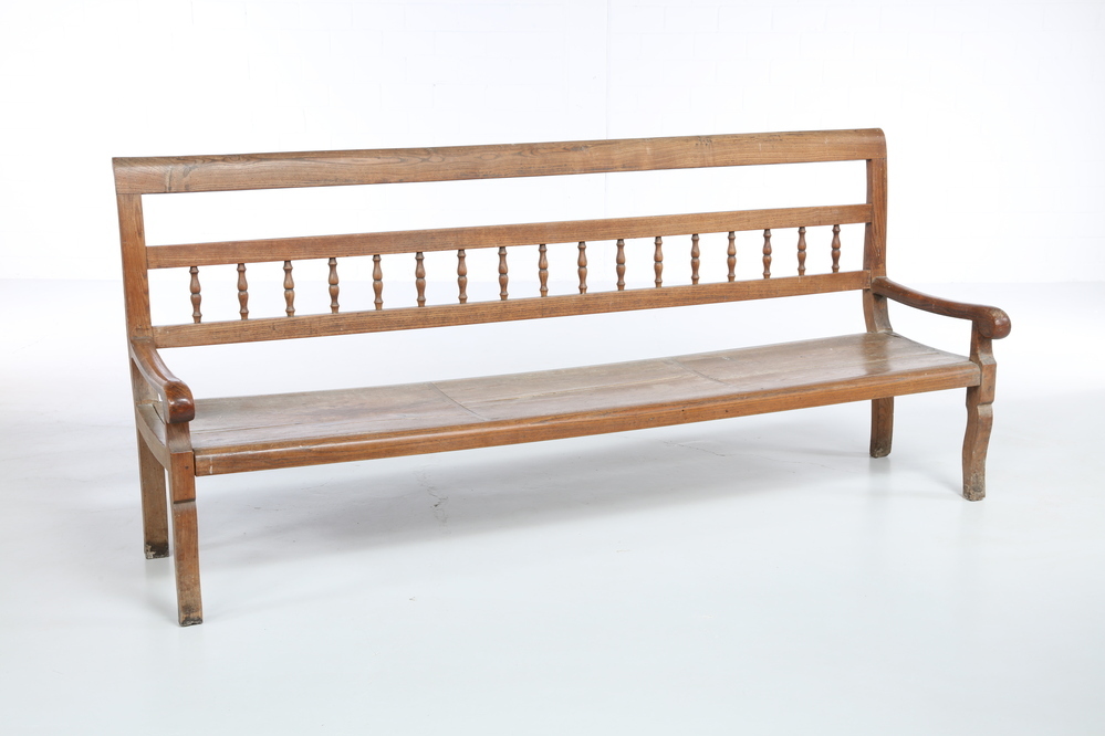 Holzbank mit Rückenlehne. Die Lehne besteht aus einem Mittelstück mit zwei waagerechten Streben und 17 dazwischen befindlichen gedrechselten Holzsprossen. Die Armlehnen weisen jeweils eine volutenförmige Endung auf.
