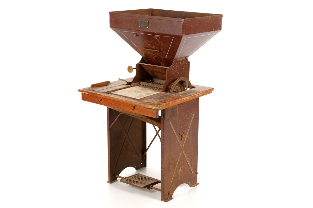 Mechanischer Sortierer zur Reinigung von Hülsenfrüchten und Getreide. Die Maschine ist in ein Stahlblechgestell integriert, dessen Aufbau einem klassischen Nähmaschinentisch ähnelt. Zwischen den Standbeinen befindet sich ein Pedalantrieb (Fußantrieb über eine Tretvorrichtung), der über ein Schwungrad das Sortierband in Bewegung setzt. Auf dem Gestell liegt eine Tischplatte, in die die Sortiereinheit eingelassen ist. Diese besteht aus einem Einfülltrichter, der auf ein schräg gestelltes Förderband mündet. Durch Betätigen des Pedals wird das Band angetrieben. Die zu reinigenden Hülsenfrüchte (Erbsen oder Linsen) gelangen vom Trichter auf das Band und durchlaufen ein sogenanntes Fingersieb – ein Sieb mit flexiblen Metall- oder Holzstiften, durch deren Zwischenräume nur runde oder kleinere Teile fallen können. Gröbere oder kantige Fremdbestandteile bleiben darauf liegen und werden aussortiert. Die gereinigten Hülsenfrüchte rutschen über eine abschüssige Rinne unterhalb der Tischplatte in ein Auffanggefäß. Die Metallteile der Maschine sind rot gestrichen; der Antriebsriemen ist gerissen. Ein Typenschild des Herstellers ist mittig am oberen Rand des Trichters angebracht.