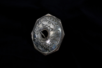 Zylindrische Tasse mit Untertasse aus Porzellan. Auf die Wandung der Tasse ist ein fotomechanisches Bild einer alten Dame mit Haube gedruckt. Das Bild wird von einem goldenen Medaillon gerahmt. Unter beiden Gegenständen findet sich eine sehr verwischte unterglasurblaue Adlermarke. Auf der Unterseite der Untertasse ist zudem eine eingeritzte Pressmarke zu erkennen: "51; III".