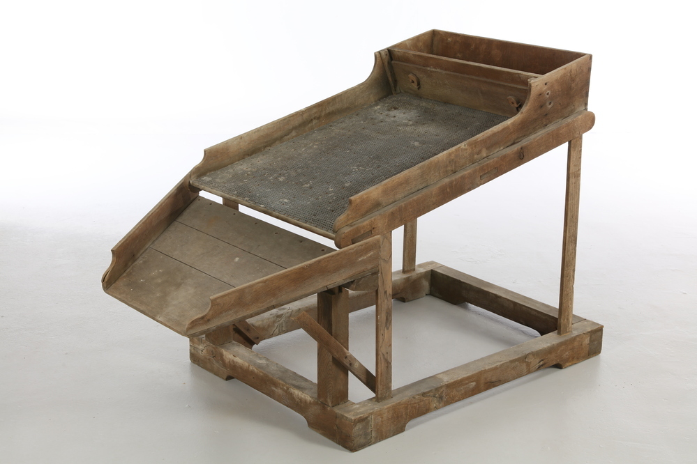 Leinklapper zur Reinigung von Leinsamen. Das relativ seltene Gerät besteht aus einem rechteckigen Rahmengestell aus Kanthölzern, in das die vier Beine der schrägstehenden Rüttelplatte eingelassen sind. In Betrieb wurde die Rüttelplatte von Hand über vier beweglich gelagerte Latten in Schwingung versetzt. Diese Konstruktion erzeugt eine federnde Bewegung, durch die die aus dem Füllkasten rutschenden Leinsamen zwischen den Seitenwänden hin- und hergeschleudert wurden und gleichzeitig über das Lochblech in Richtung der offenen Unterseite des Geräts liefen. Dabei blieben anhaftende Schalenreste in den Zwischenräumen der Lochblechplatte hängen, während die Leinsamen durch den Ausfluss am unteren Ende aus der Maschine fielen.
