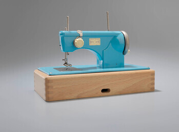 Die Mitteldecke besteht aus beigem Stramin und ist an den Kanten mit einer braunen Posamentenborte (dekorative Kante aus gewebten oder geflochtenen Fäden) verziert. Die Stickerei zeigt Blumenranken in Grün und Rosa, während die Mitte der Mitteldecke frei bleibt.