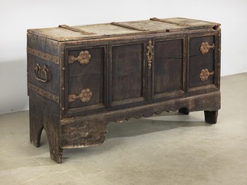 Zweiflammige Öllampe aus gegossenem Messing mit einem tellerförmigen Standfuß. Am balusterförmigen schlanken Schaft ist etwas unterhalb der Mitte ein Ölbehälter mit zwei gegenüberliegenden Dochtröhren befestigt. Darüber verjüngt sich der Schaft erneut zu einem Stab und endet mit einer dreipassförmigen Grifföse.