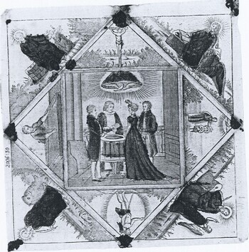Dieser Brief von 1820 liegt als schablonenkolorierte Radierung vor. Auf der Vorderseite befindet sich mittig eine Taufszene, welche von acht weiteren dreieckigen Szenen umgeben ist. Die inneren Dreiecke stellen die Verkündigung, Johannes den Täufer, die Taufe Jesu im Jordan und den Sündenfall Adams und Evas dar. Die äußeren vier Dreiecke zeigen Maria mit Kind, die Flucht nach Ägypten, die Kreuzigung und die Auferstehung. Auf der Vorderseite befinden sich Siegelreste. Die Innenseite bildet ein Buchdruck und die handschriftliche Ergänzung mit Tusche: „18 Juny Agnes Jacob. von […] Anno 1820“. Die Ecken sind zweimal zur Mitte gefaltet.