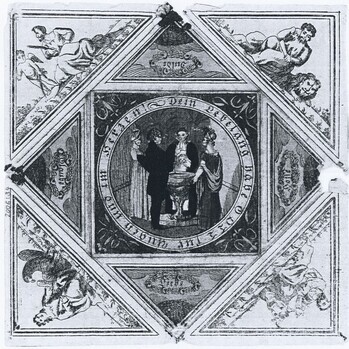 Dieser Brief von 1842 liegt als kolorierte Radierung vor. Auf der Vorderseite befindet sich die Darstellung eines Mädchens beim Gärtnern mit Spaten und Gießkanne. Links von ihr steht ein Sockel mit der Aufschrift „Wachse und Gedeihe“; auf dem Sockel liegen eine brennende Fackel, ein Lorbeerkranz und ein Zweig. Den Umschlag bilden vier Dreiecke. Diese sind ornamental gestaltet. Mittig sind Siegelreste erhalten. Ein beiliegender Zettel mit den Maßen 6,6 x 9 cm mit einem Buchdruck trägt eine handschriftliche Widmung mit Tusche: „Deinen treuen Taufbathen Johann Höllang. den 30ten Januar. 1842.“.