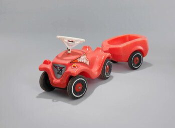 Puppenstube aus Holz mit drei tapezierten Wänden mit Dekofolie (D-C-Fix) überklebt. Die weiß lackierten Einrichtungsmöbel sind versehen mit Rosen-Dekorationen. Zur einen Seite der Stube ist ein Schlafzimmer eingerichtet mit einem großen Bett mit Bettwäsche, zwei kleinen Kinderbetten aus Holz und Metall, zwei Nachtschränken, einem Standwecker, einem Spiegel und einem kleinen weißen Nachttopf. In der Mitte der Stube steht ein verzierter Tisch mit Kerzenhalter und einem blauen Becher. Zu beiden Seiten des Tisches steht jeweils ein Stuhl. Die andere Seite der Stube ist eingerichtet mit einer Kommode mit Handspiegel und einer Vase mit Blumen auf der Ablagefläche, daneben eine große Garderobe mit Spiegel. Davor steht ein kleiner roter Hocker. Auf der Langseite der Stube ist ein Fenster mit schmalen Spitzenstoffstreifen als Gardinen eingebaut. Vor dem Fenster ist eine Sitzbank platziert.