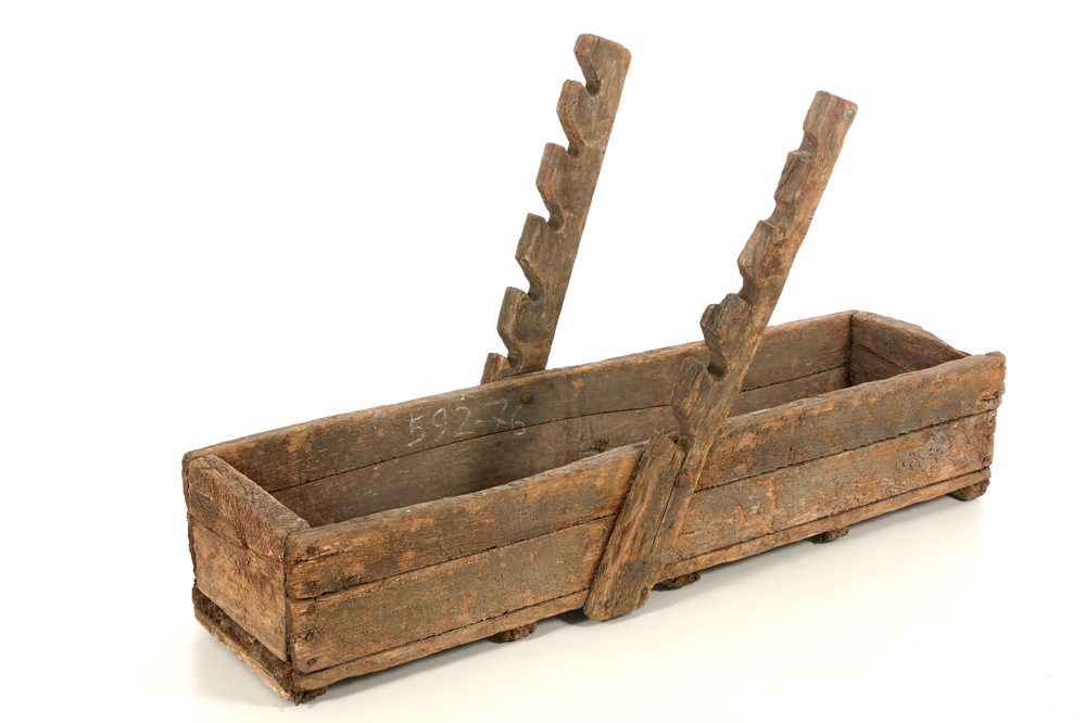 Radkühltrog zur Fertigung von hölzernen Wagenrädern. Das Gerät besteht aus einem rechteckigen Wasserbehälter mit zwei angeschrägten Halterungen an den Längsseiten, die jeweils eine Aussparung zum Einhängen eines Rads besitzen. In Betrieb diente der Trog der Abkühlung des zuvor erhitzten Radreifens, nachdem dieser auf den Radkranz aufgezogen worden war. Durch das Drehen des Rads im Wasserbad wurde der Metallreifen abgekühlt, zog sich zusammen und schloss das Rad stabil ein.