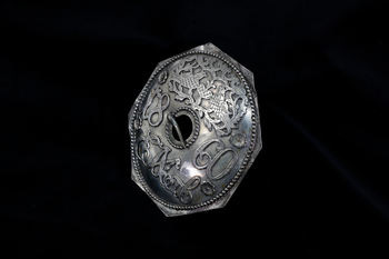 Der Rock aus schwarzem Stoff mit Kreppeffekt ist mit Maschine genäht. Er hat ein schmales Bündchen aus schwarzem Baumwollsatin, an das nach unten ausgestellte Bahnen angesetzt sind. Unten am Rock befindet sich eine in wenige Falten gelegte Rüsche. Der Rock ist vorne glatt, hat den Einstiegschlitz in der vorderen Mitte und ist über die Rückseite in Falten gelegt. Die Ansatznaht der Rüsche ist mit einem schwarzen Samtband verdeckt und die Rüsche selbst mit zwei Samtbändern verziert. Der Saum hat eine Besenlitze und innen einen Schmutzrand aus schwarzem köperbindigem Baumwollstoff.