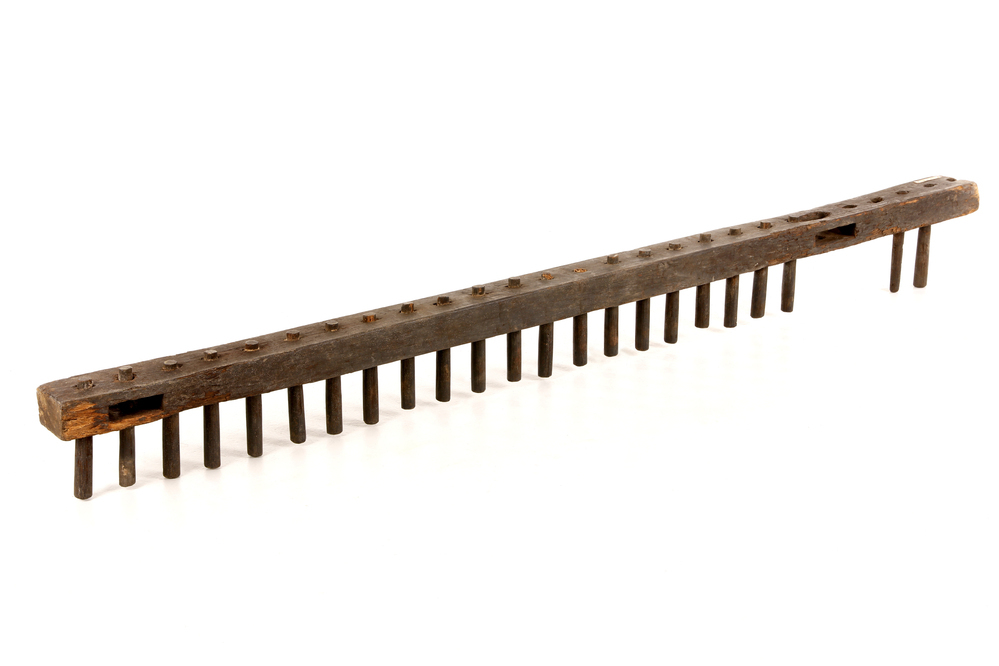 Rahmenholz eines Scherrahmens zum Sortieren von Kettfäden. Das Rahmenholz kann über Zapfenverbindungen mit drei anderen Rahmenhölzern verbunden werden, um einen rechteckigen Scherrahmen zu bilden. Im Rahmenholz stecken senkrechte Holzzapfen, auf denen im Prozess des Scherens die Kettfäden aufgezogen werden.