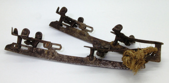 Schlittschuhe zum Befestigen an Schuhen. Sie sind mit einem Schlüssel verstellbar. Die Kufen wurden vermutlich mit den Schuhen Inv. 2017:336 verwendet.