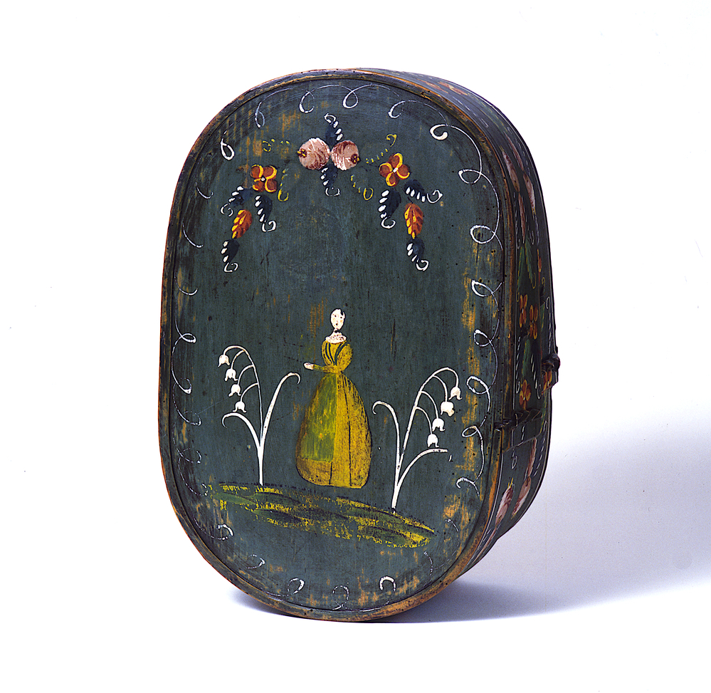 Hochovale Spanschachtel mit bemalter Oberfläche. Die Grundfarbe ist Blau. Auf dem Deckel ist mittig eine Dame dargestellt, umgeben von stilisierten Maiglöckchen. Die umlaufenden Zargen sind mit einem mehrfarbigen floralen Muster verziert.