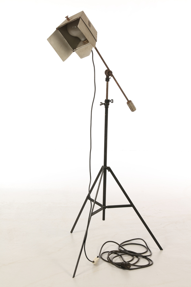 Leuchte mit verstellbarem Schirm und Torblenden zur gezielten Lichtsetzung. Die Leuchte ist an einer drehbaren Stange montiert, die über ein Gelenk auf einem Stativ befestigt wird. Sowohl Schirm als auch Stange lassen sich jeweils um 360° drehen und neigen. Die vier am Lampenschirm befestigten Torblenden ermöglichen eine gezielte Steuerung des Lichtaustritts. Solche Leuchten wurden z. B. als Haarlicht in der Porträtfotografie eingesetzt, um Lichtakzente zu setzen und Konturen hervorzuheben.