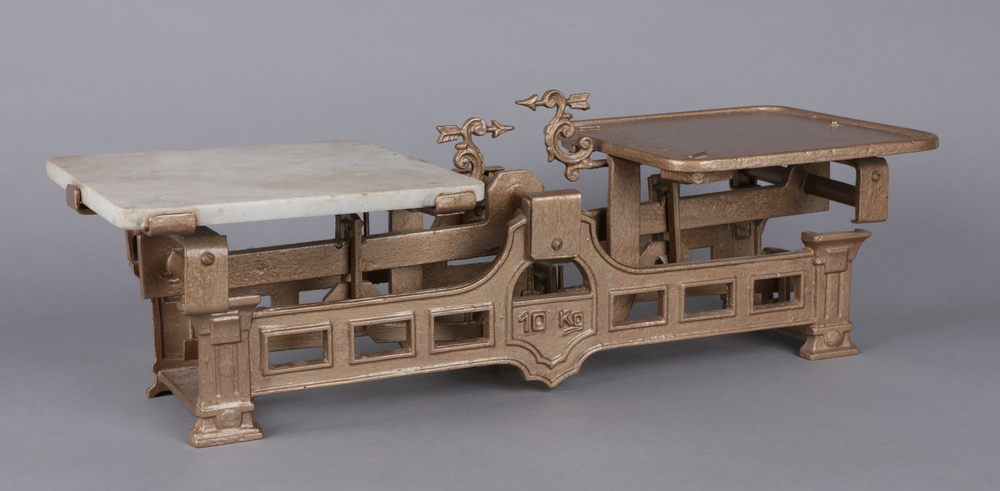 Tafelwaage mit Wiegebereich bis zu 10 Kg. Sie besteht aus einem gusseisernen Untergestell mit zwei Wiegetischen, von denen eine Seite mit einer weißen Marmorplatte ausgestattet ist. Die Gewichtindikatoren sind als dekorativ geschwungene Pfeile ausgeführt. Auf dem Untergestell ist das Gewicht "10 Kg" vermerkt. Die Waage ist einheitlich mit bronzefarbener Lackfarbe überlackiert worden. Die dazugehörigen Gewichte sind unter der Inventarnummer 2024:224.2 inventarisiert.